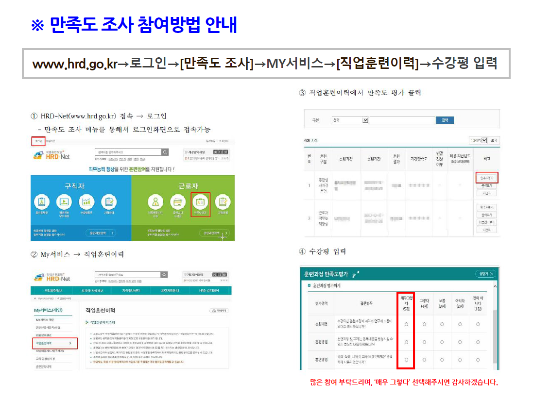HRD-Net 홈페이지에서 만족도 조사 항목이 오픈되었습니다.