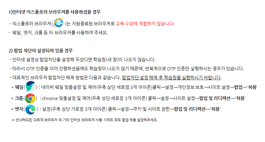 ※ 크롬 브라우저는 브라우저 업데이트에 따라 chrome 맞춤설정 및 제어 → 설정 → 개인정보 보호 및 보안 → 사이트 설정 → 팝업 및 리디렉션 '허용' 으로 변경될 수 있습니다.